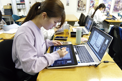 専門的なデジタルソフトの使い方や漫画、イラストの表現方法といったプロを目指せる技術を学んでいきます。