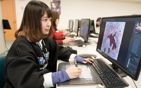 パソコンとタブレットを使用して「CLIP STUDIO PAINT」「Photoshop」などデジタルツールの使い方やデジタルイラスト制作のテクニックを身につけます。また進路に合わせたポートフォリオの作り方やまとめ方も学びます。