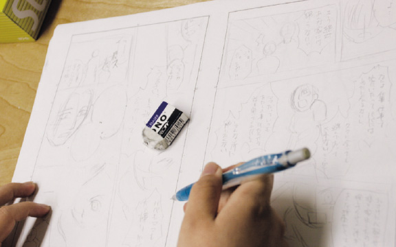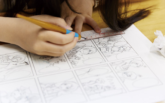 漫画の描き方やストーリーの作り方、専門用語など漫画を描く上で必要な知識を学びます。また漫画編集部への持ち込み用オリジナルストーリー漫画制作も行います。