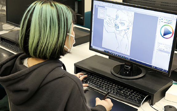 ペンタブレットと「CLIP STUDIO PAINT(漫画・イラスト制作ソフト)」を使用してデジタルでの漫画制作テクニックを学びます。入稿作業まで意識して実習します。