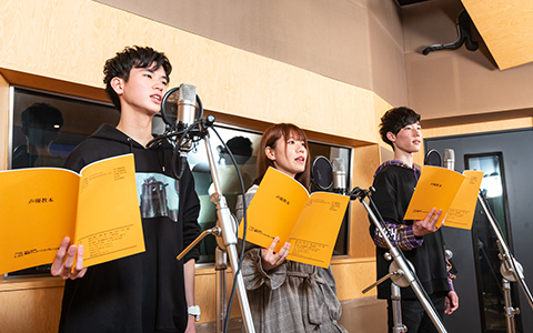 アニメーション作品、洋画の吹き替えなど声優としてのアフレコ収録を実践的に行い、マイクワークから表現方法までの技術を学びます。また、授業の集大成としてグループ毎に分かれオリジナルアニメーションのアフレコを行います。
