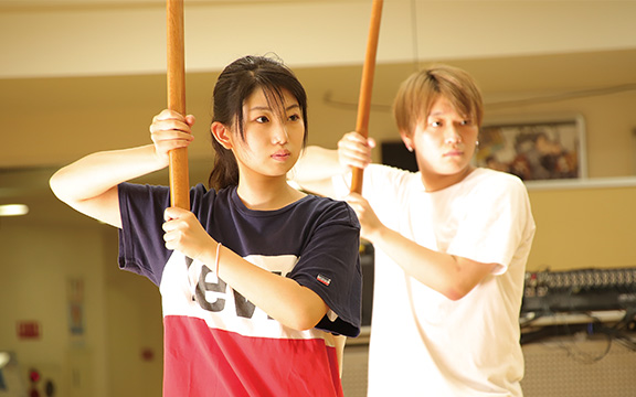 殺陣やアクション俳優に必要な技術や基礎を学びます。刀や長物を安全に扱う技術や、体幹トレーニングなどアクション俳優に必要な身体づくりもしていきます。