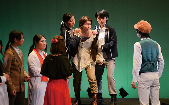 演技における体づくり、身体表現などの基礎を学び、台本を使用した演技で表現の仕方を基礎から学びます。3年次は演劇作品制作(卒業公演)を通して1つの作品をクラスで作りあげる工程を学びます。